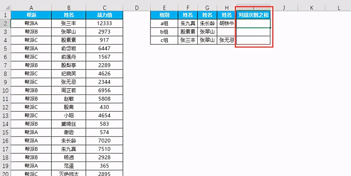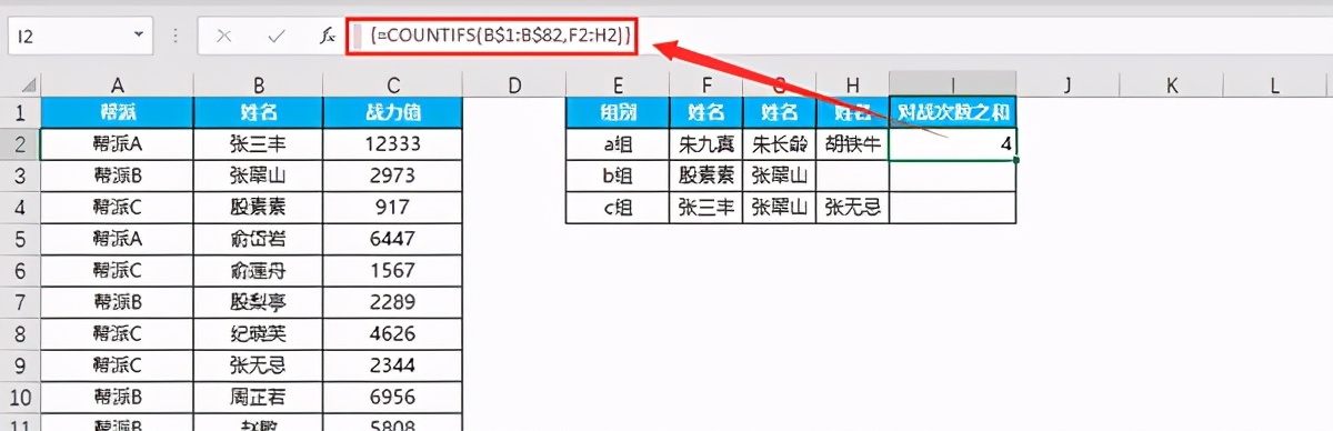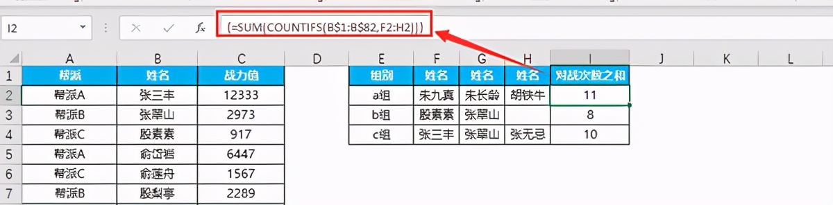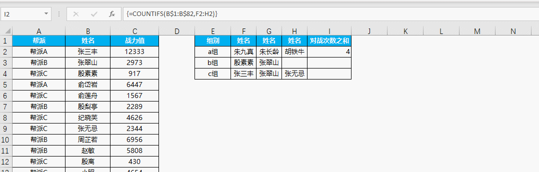 案例中,我们左边数据源每一条记录代表着一次对战,我们要求各组别总的对战次数,由于组别是随机分的,我们数据源中没有组别这一列关键字,常规情况下我们可以用多个COUNTIFS函数相加来得到结果: