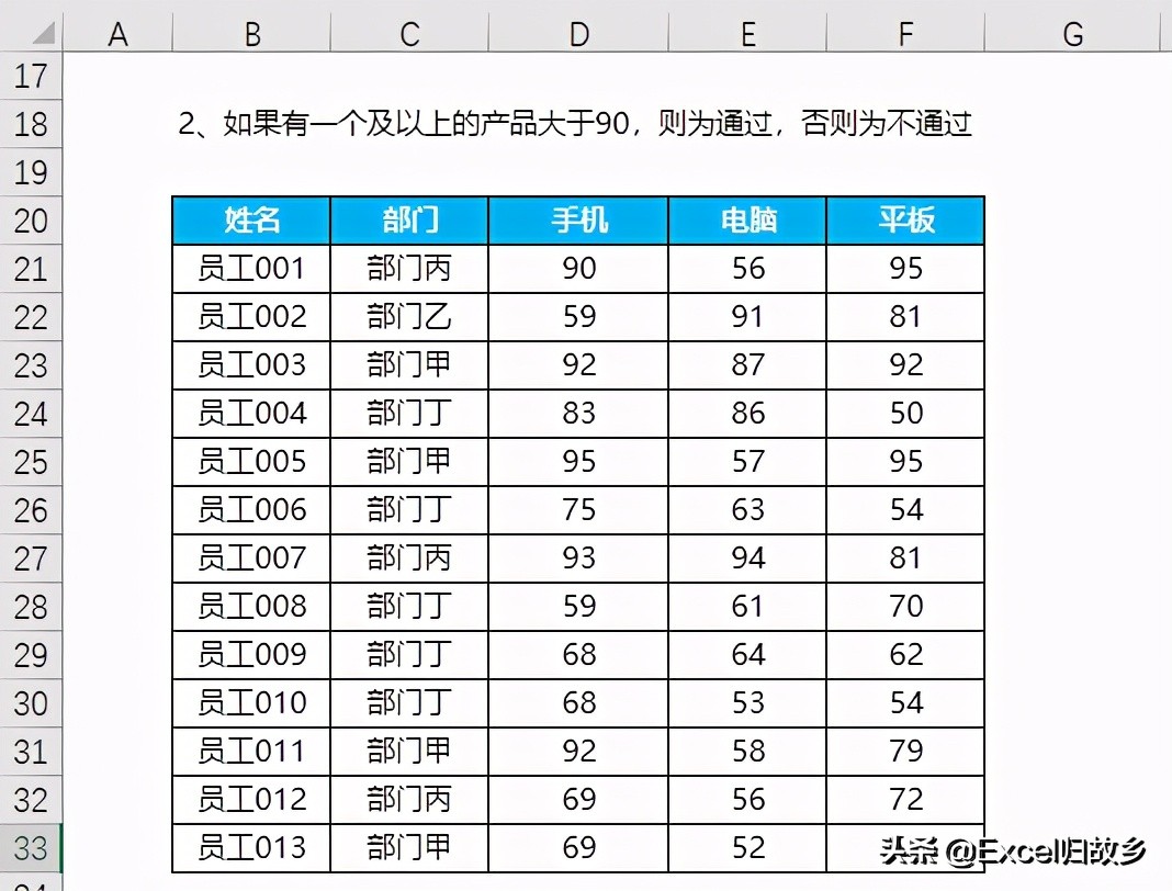 案例要求:基于以下数据,如果有一个及以上的产品大于90,则为通过,否则为不通过,请做出判断。