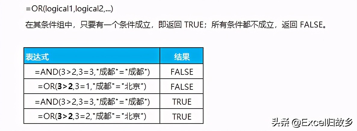 各位小伙伴们大家好,我是Excel归故乡。本期接着给大家讲解比较重要的一个逻辑函数,OR函数。OR函数的要求就要比AND函数宽松一些,我们上期说了,AND函数需要每个条件都满足才返回TRUE,而OR函数只要有1个或者1个以上的条件满足要求,就返回TRUE。写法和AND函数一样=OR(条件1,条件2……)。我们看个示例,同时与AND函数做个对比: