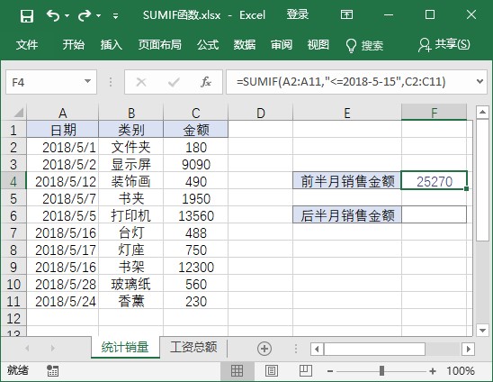 选择要存放结果的单元格F4,输入函数“=SUMIFS(C2:C9,A2:A9,">2018-5-10",A2:A9,"<2018-5-20")”,按下【Enter】键,即可计算出该商品在该月中旬的销售情况,如下图所示。