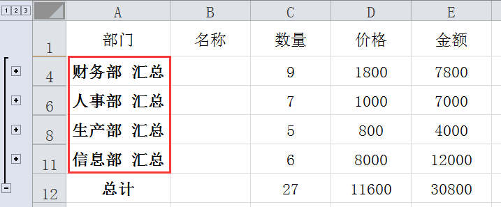 大家看,点击确定后,Excel会自动依据部门,进行数据的汇总求和。我们来点击分级符号2。