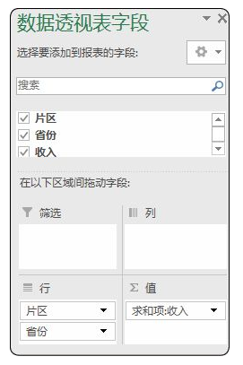先把合并单元格取消,填充空白部分,方法见第1章第9招,再选中表格所有数据,单击插入→数据透视表,先把“片区”拉到行标签,再把“省份”拉到行标签,“收入”拉到数值,如图2-6-11所示。