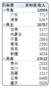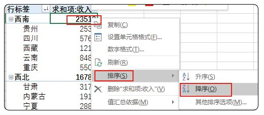 再看看各片区省份的排序,单击西南片区下面的任意省份,单击右键选择排序,按降序排序,这样各片区都按照省份收入数据排序了,如图2-6-14所示。