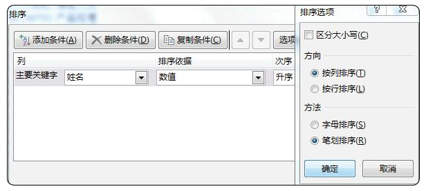 单击“选项”按钮,排序有方向和方法可以选择,比如通常姓名按照笔画和字母排序,如图2-6-3所示。