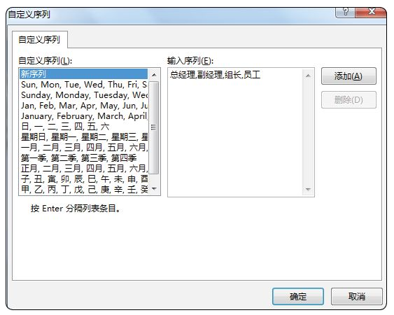 自定义排序之前要先自定义序列,不同序列值间要用英文状态下的逗号隔开,如图2-6-5所示。
