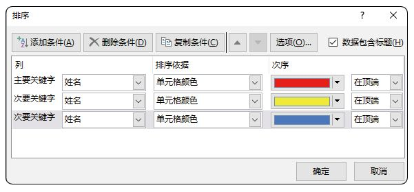 排序依据可以按照数值,也可以按照单元格颜色、字体颜色、单元格图标排序,例如,单元格姓名字段有红、黄、蓝三种颜色,各种颜色杂乱无章,要把三种颜色按顺序排序,排序关键字设置如图2-6-4所示。