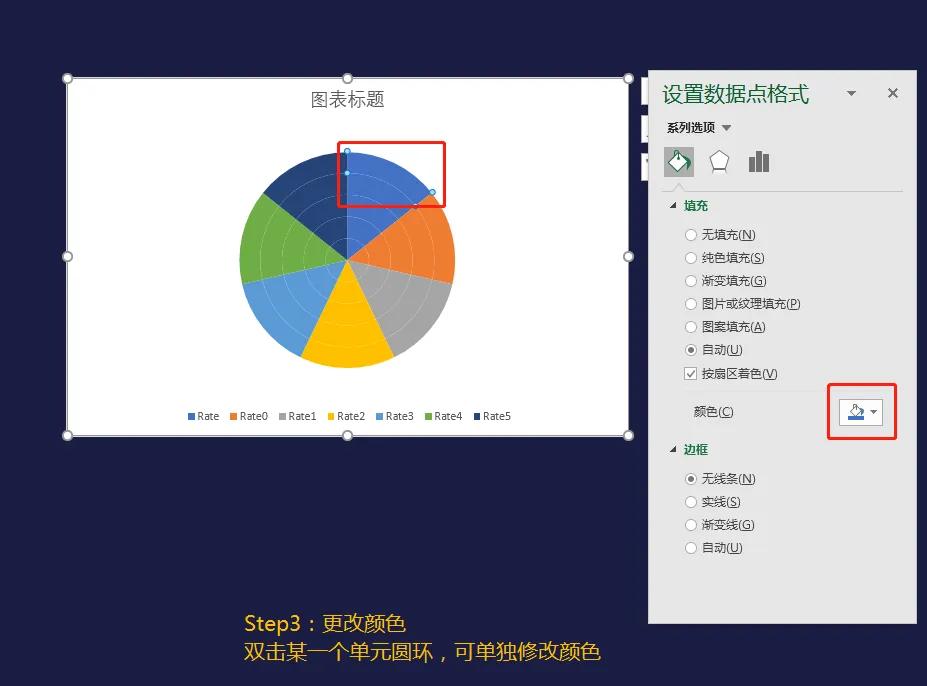 如果你按照上面的步骤来,看到这个样式应该就知道怎么修改了,右时针方向最外层的圆环逐渐减少,点击某个圆环两次可更改颜色!