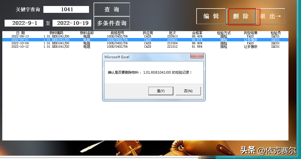 3.2 检验记录删除:选择检验记录查询框的数据后,再点击“删除”按钮,在弹出的确认对话框点击“是”即可删除对应的检验记录。