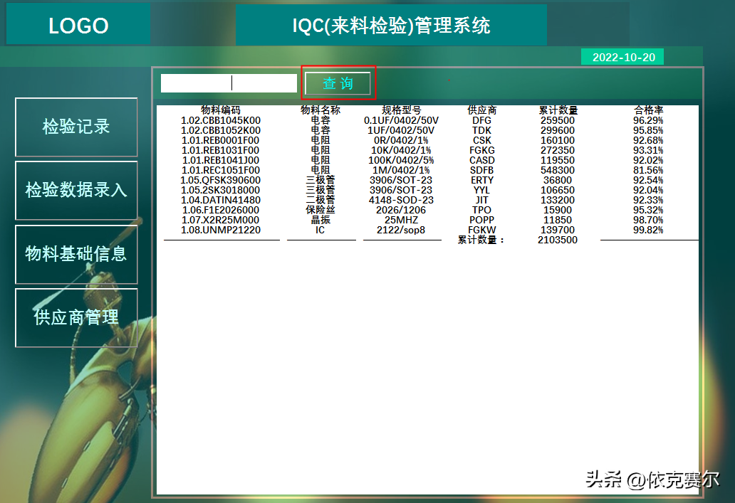 1、物料检验统计:点击主界面“查询”按钮,也可查询当年系统内所有物料的数据汇总信息,可在查询框输入内容后按关键字查询。
