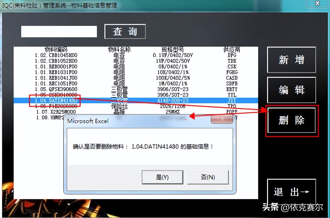 4.3 物料基础信息删除:在物料基础信息的查询框选择要删除的物料后再点击“删除”按钮,在弹出的确认删除对话框选择“是”可删除对应的物料。