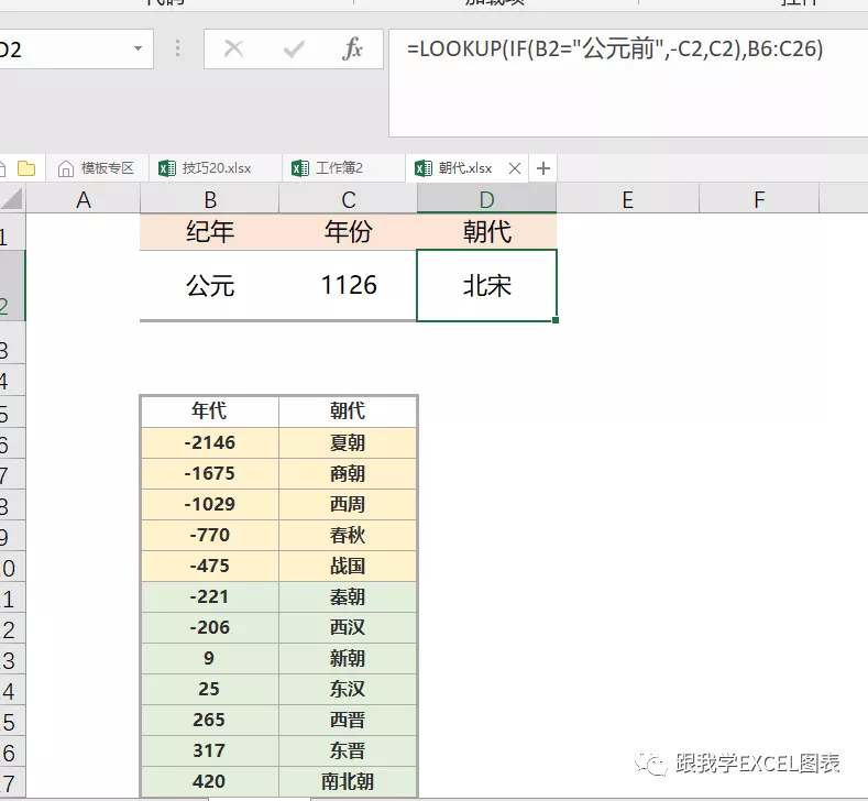 朝代的查询结果位置D2单元格输入=LOOKUP(IF(B2="公元前",-C2,C2),B6:C26),if函数主要作用是将公元前的年代变为负数,公元后是正数,是不是最后发现这个函数好简单。