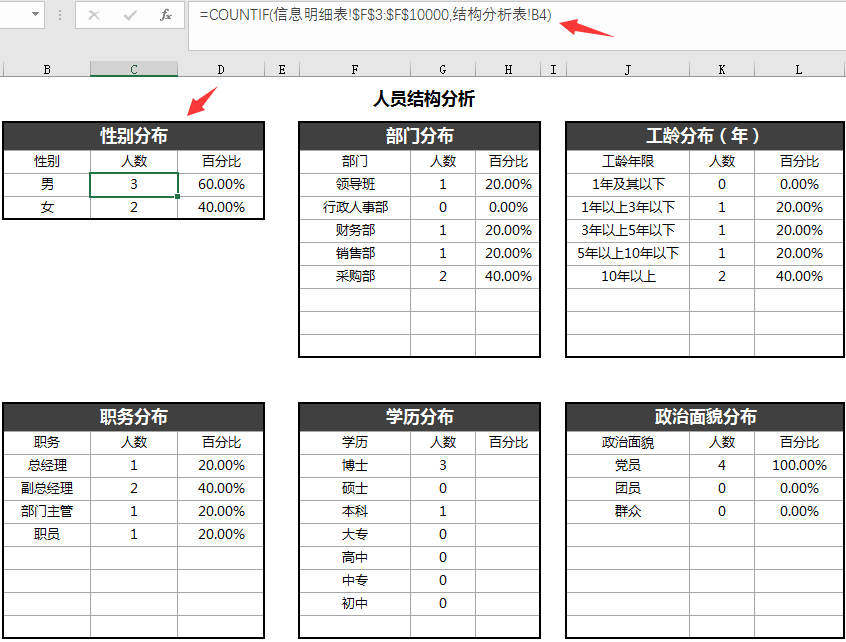 人员结构分析表,按照性别,部门,工龄,职务,学历等自动生成数据,一目了然。