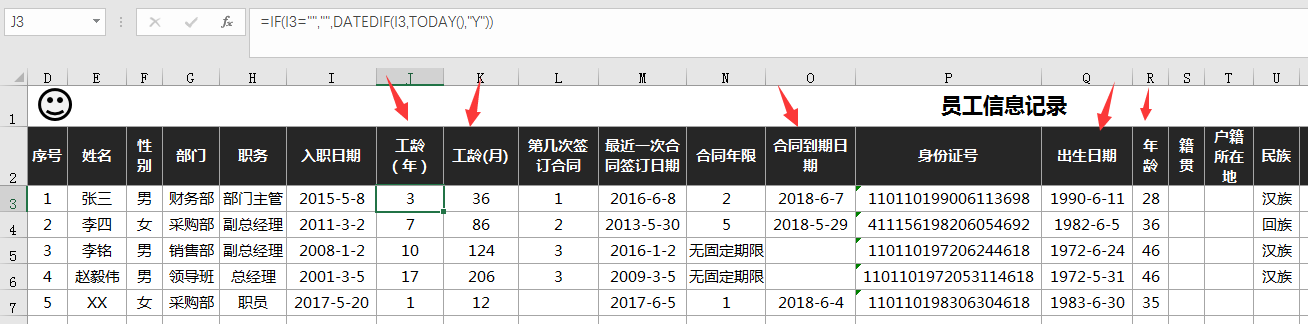 员工基础信息表录入基础信息,大家注意函数单元格,不要删改,自动生成数据。