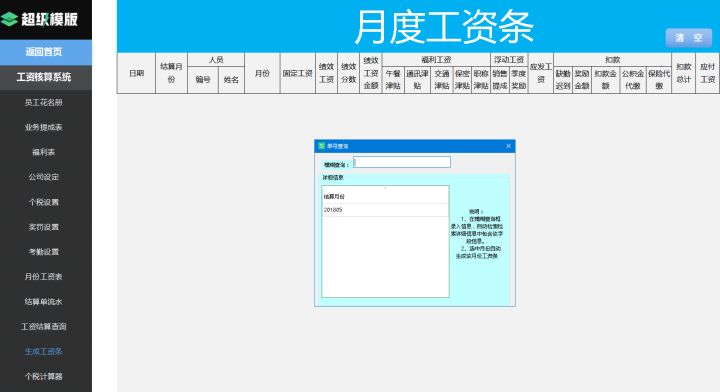 点击【工资条】后会弹出窗口,这个时候我们只要选择需要生成的月份工资条,就能够直接生成了。