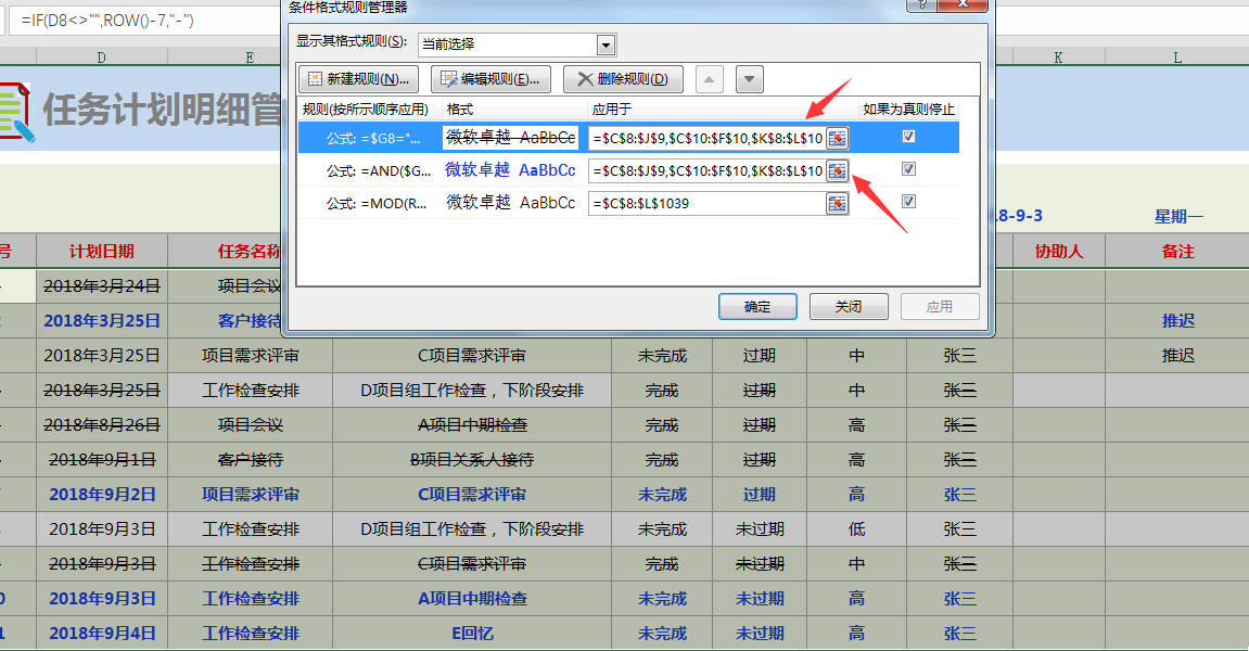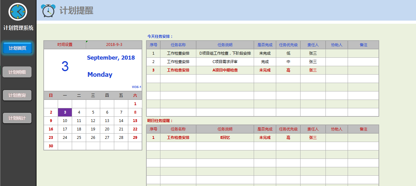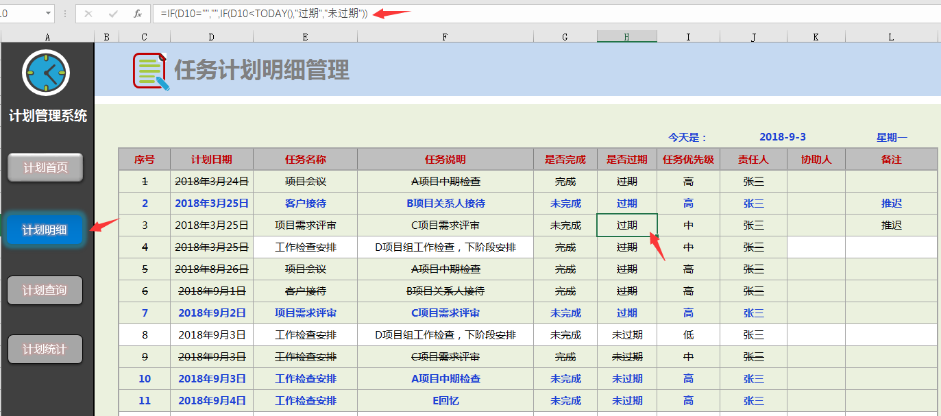 计划明细按表格式录入,函数自动显示工作任务是否过期。
