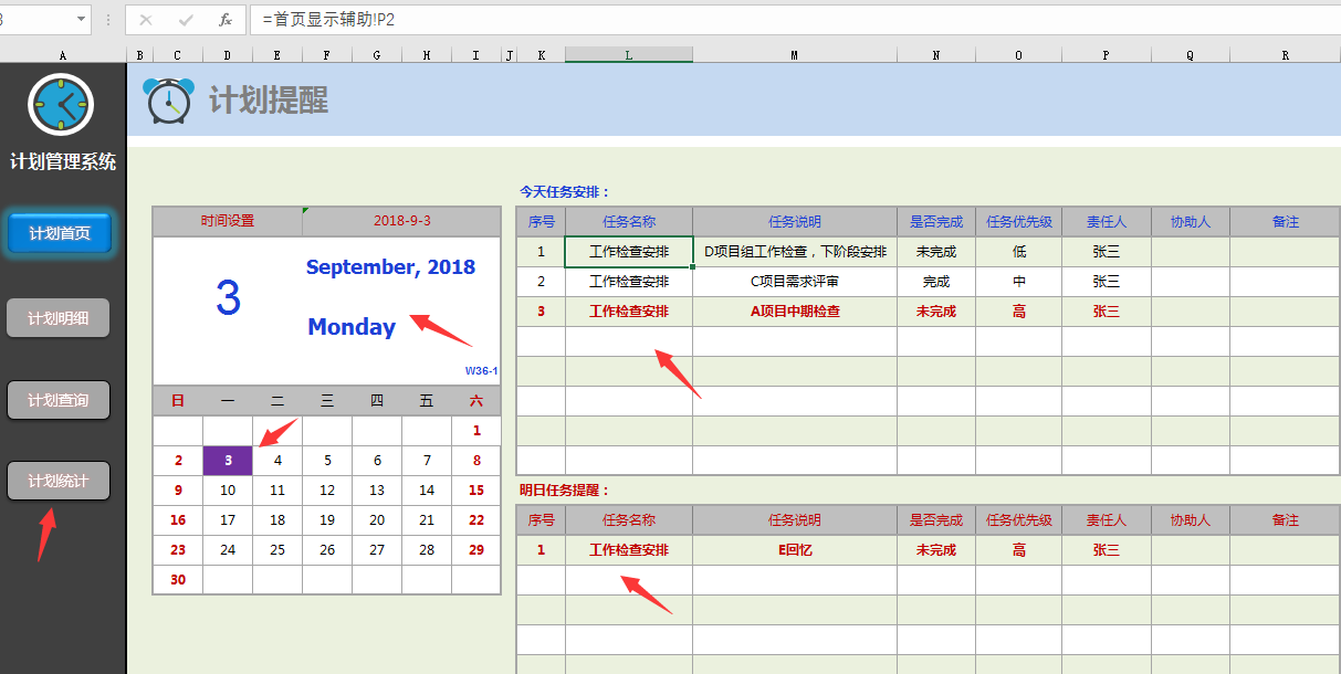 左侧工作表目录点击跳转,中间当前日期,日历显示。右侧全函数自动显示今日工作安排,明日工作计划。