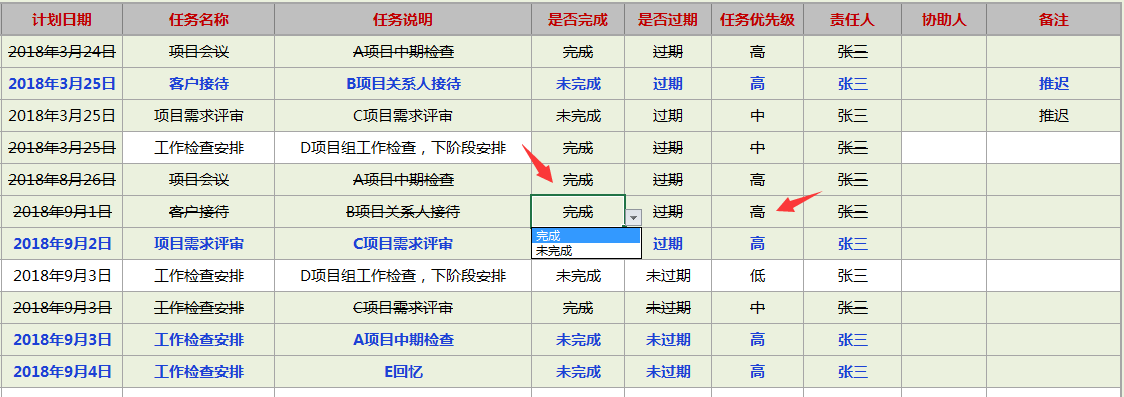 优先等级选择高的,整行变为蓝色高亮提醒。选择工作已完成的,整行自动添加删除线。