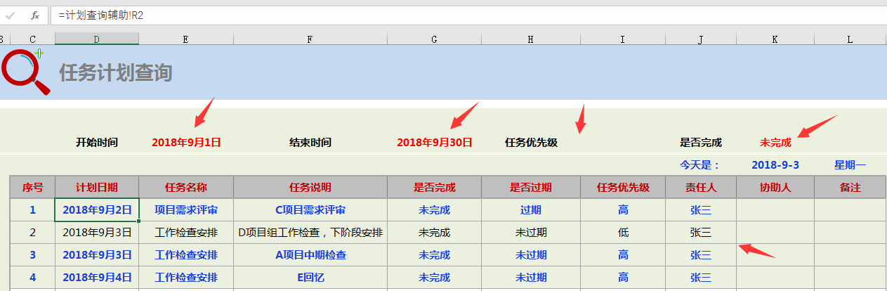 工作计划任务查询表,输入时间区间,选择完成情况,优先等级,自动显示查询结果。不舒服查询条件的,表示不做限制。