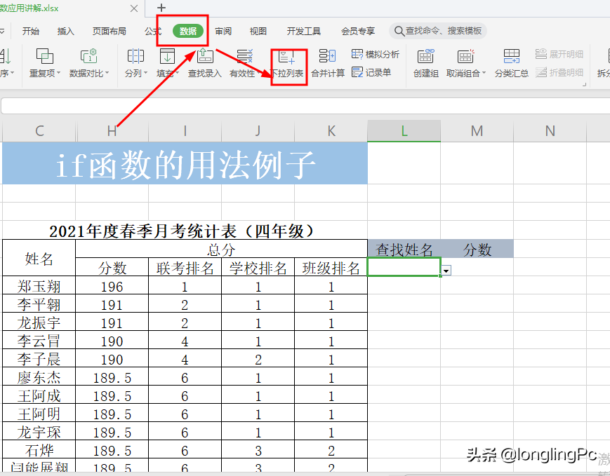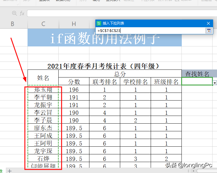 首先,我们在“查找姓名”单元格下,创建一个学生名字的下拉列表。