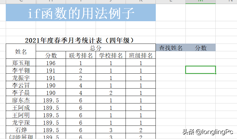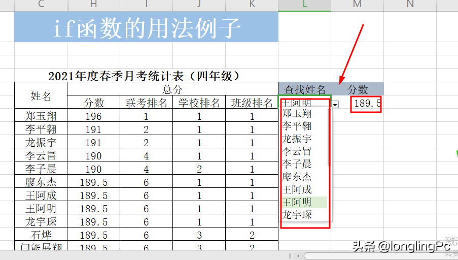 公式的意思即为,在c7到H7单元格中,查找学生姓名,并返精确返回H7列的值。通过这个公式,我们就可以从学生下拉列表中选择学生姓名,在分数栏就会自动返回该学生的总分,如下图: