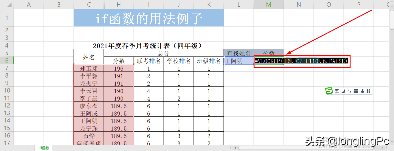 现在我们再光标定位到需要查找的分数列下,输入"=VLOOKUP(L6,C7:H110,6,FALSE)。