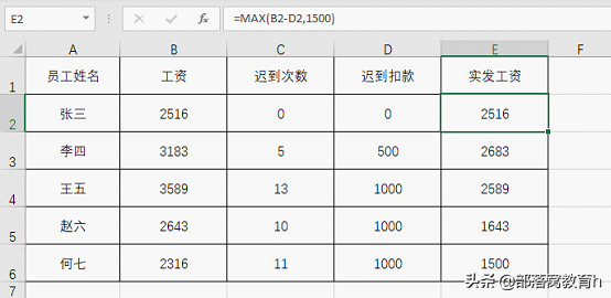 “MAX函数的用法和MIN一模一样,这里我就不再赘述了。我们最低工资是1500元,现在要保证扣除罚款后剩余的工资不低于1500元。”如下图所示: