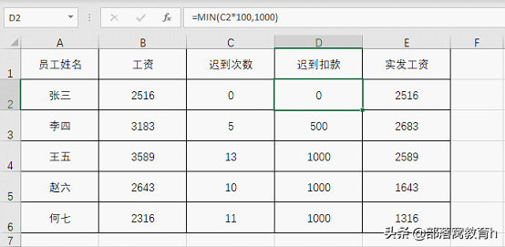里面的扣款金额有0、500、1000,超过1000的,那么超过1000的,就不符合我们的要求了,所以我们需要在公式上进行修改,用上MIN函数。如下图所示: