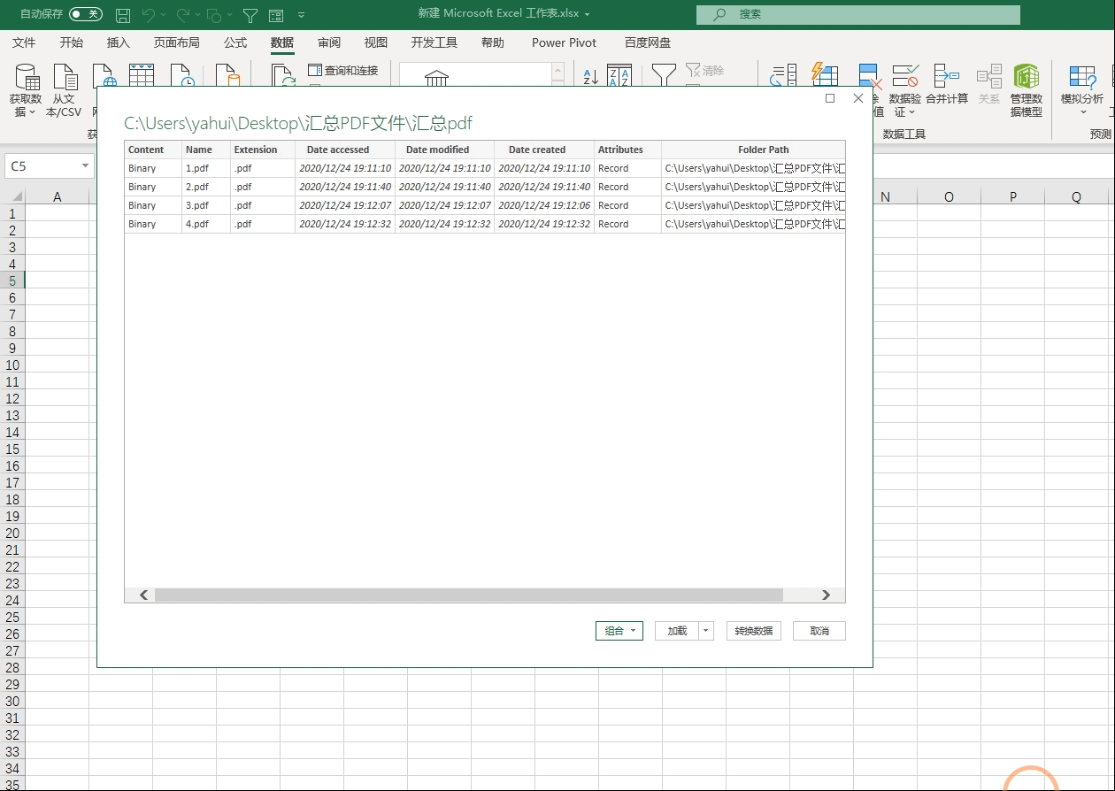 首先我们需要将想要汇总的PDF文件都放在一个文件夹中,然后我们复制文件路径,再新建一个Excel,点击【数据】功能组,然后在左侧找到【获取数据】→【来自文件】→【从文件夹】,跳出对话框后我们将刚才复制的文件路径直接粘贴过去然后点击确定,这样的话就会跳出数据选择的窗口