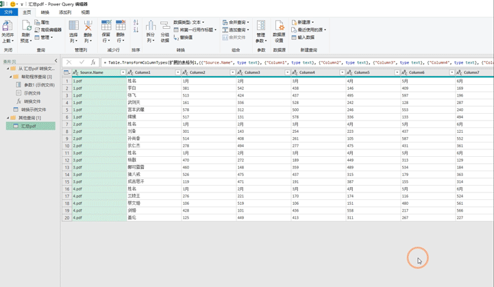 首先我们在主页中找到【将第一行用作标题】来提升一下标题,随后我们点击在1月这个标题上面的筛选按钮将数据中的1月筛选掉,这个的作用是将其他表格中的标题去掉,至此就汇总完毕了,第一列是文件的名称,其余的是数据,这个时候我们只需要在主页中找到关闭并上载至,将数据加载到Excel即可