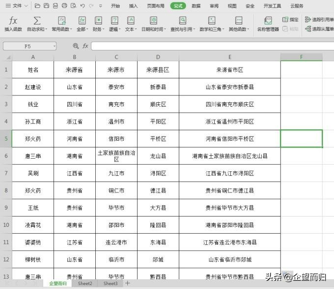 我们看一下表格中的省市区是分开填写的,要把省市区内容合并在一起。首先,表格中选择E2单元格