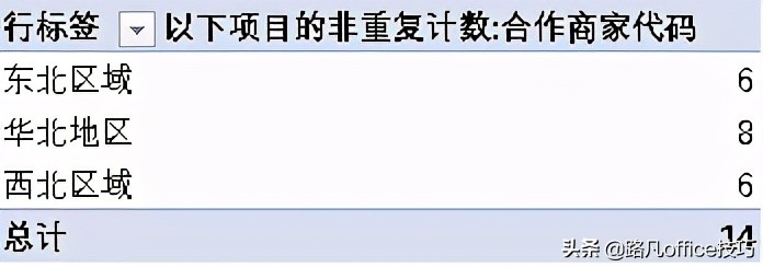 从上图中可以看到,在同一区域内合作商家代码列数据时有重复数据存在的,那我们在计算时则需要计算的非重复的数量(即重复数据统计为1),具体操作步骤如下: