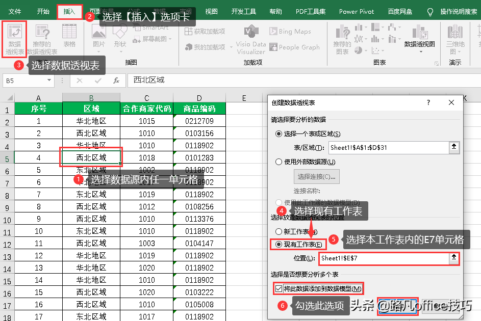 选择数据源表内任一单元格 — 选择【插入】选项卡 — 选择【数据透视表】命令 — 在弹出来的对话框内的【选择防止数据透视表的位置】下方选择【现有工作表】,然后在【位置】后方框内选择本工作表内的E7单元格 — 勾选【将此数据添加到数据模型】— 确定