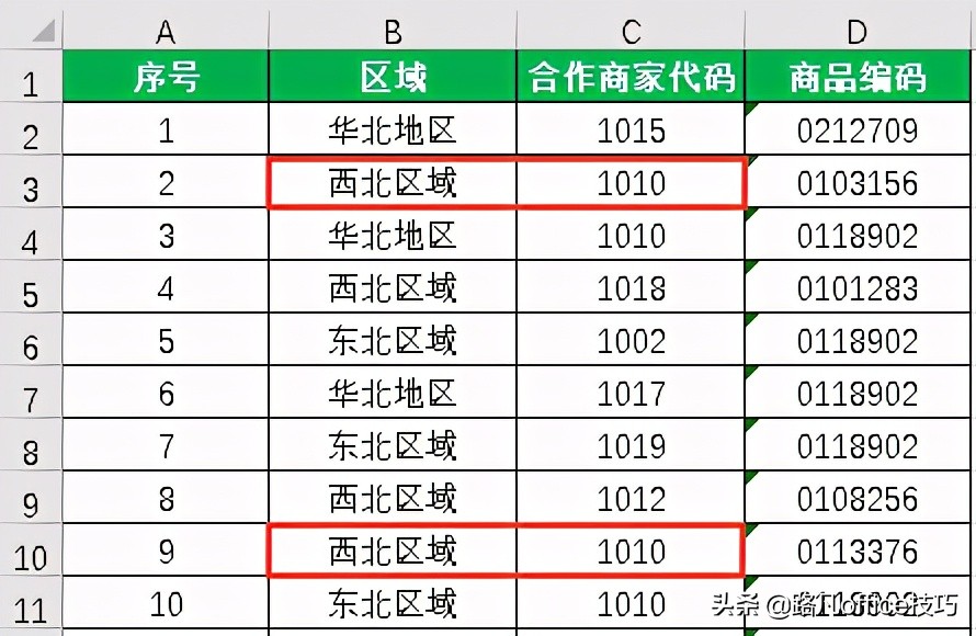 小编手上有某公司在东北、华北和西北三个区域内合作商家的基本信息,现在需要根据合作商家代码分别计算三个区域内的合作商家数量,怎么快速实现呢?小编在这里分享一个非常简单的方法,那就是使用数据透视表进行统计,数据源表如下图: