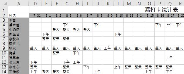 下面分享一个可以自动统计出漏打卡清单,迟到次数,早退次数的模板