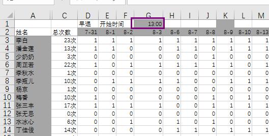 3,设定迟到的开始时间,而后全自动统计每人的迟到次数