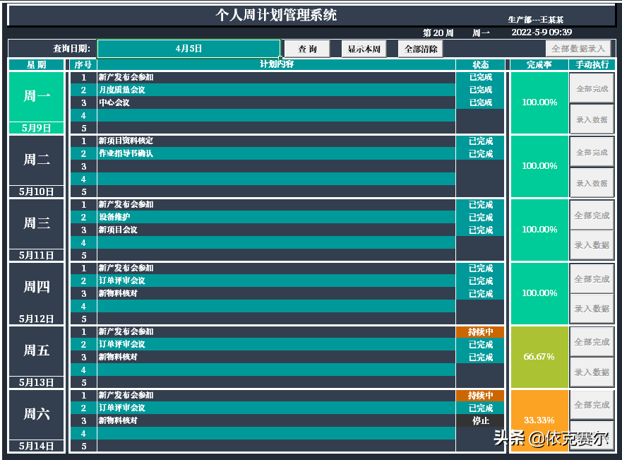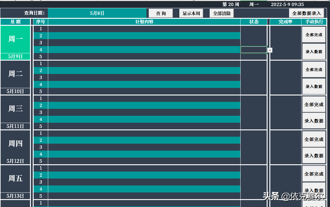 提示:本系统所有下拉信息、颜色、均可可自由更改,计划序号、日期以及星期是动态更新,均不可删除和更改。