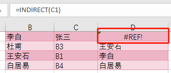 如下图,当我们将C1修改为数值后,因为其不是单元格地址,所以当输入indirect(C1)后,因为找不到单元格地址而出现错误值的现象