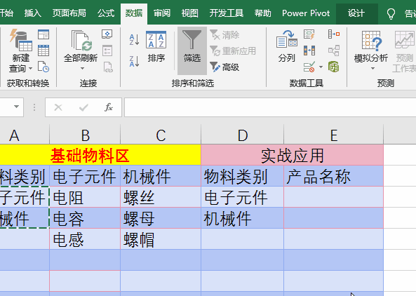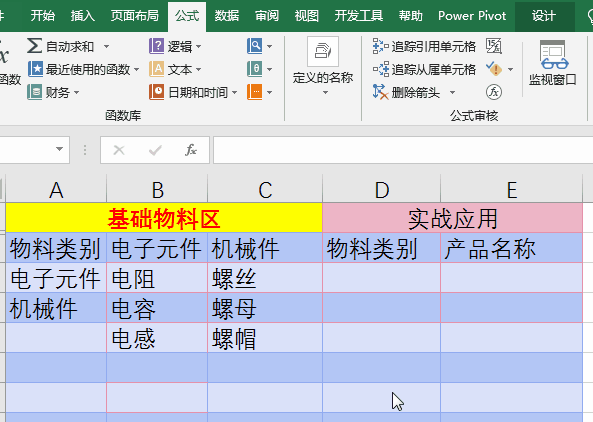 当定义名称之后,我们就可以在E列,应用indirect函数,indirect(D3),而后就会返回电子元件所对应的区域,就是电阻、电容这些内容,形成下拉菜单