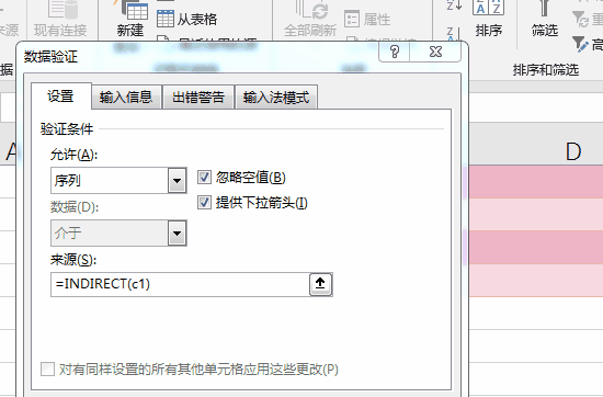 当我们在D1单元格,点击有效性验证,序列后,而后在输入函数indirect(C1)我们可以看到当我们点击下拉菜单后,就会直接让选择C1单元格内地址所代表的的数据,就是杜甫