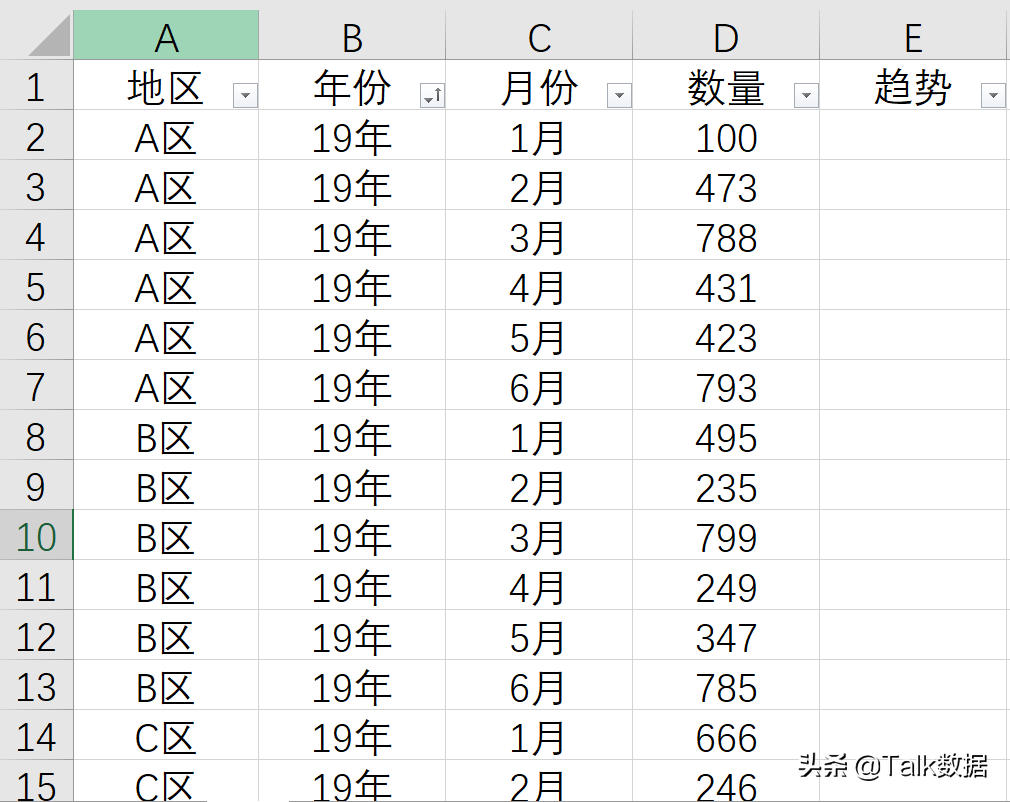 第一步,将数据源增加一列,命名为趋势,用来放置迷你图,制作透视表,以表格形式显示,不显示分类汇总。