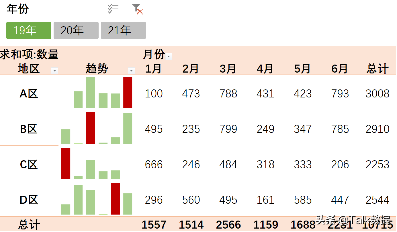 对于迷你图在表格里的应用不做介绍,我所说的是迷你图在透视表里的应用。