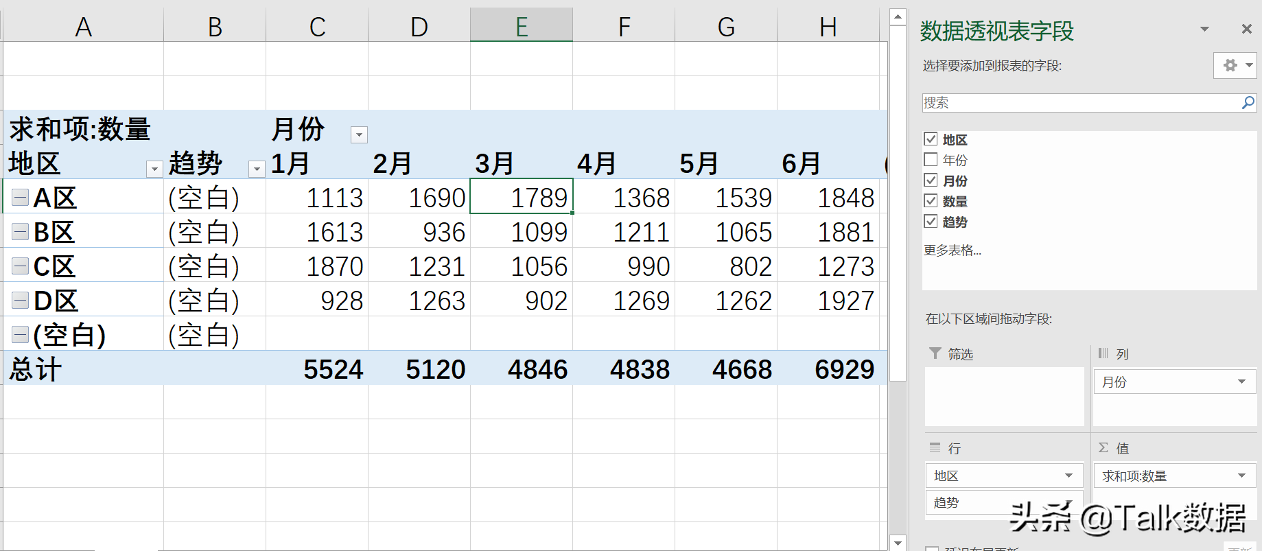 例如我需要查看区域在各个月份的销量比较。仅仅需要三步,即可完成既定效果。