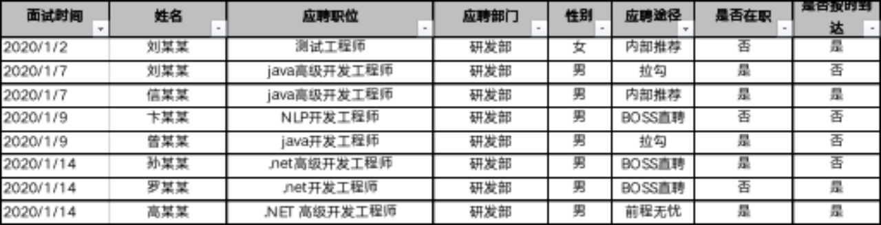 其实啊,一个简单的excel插件就可以解决问题。例如,这是一个招聘记录统计表,表头有面试时间、姓名、应聘职位、应聘部门等信息,记录了每个面试者的身份信息以及来公司的面试情况,非常的简单和容易理解,这些面试信息每天统计好会登记进去,并保持每天更新。如果只是短期内的数据倒还好,但随着数据量的日积月累,必然会影响EXCEL的运行效率,如果领导突然要你分析好几年的数据,面对这么庞大的数据,恐怕再好的电脑配置都得跪下。
