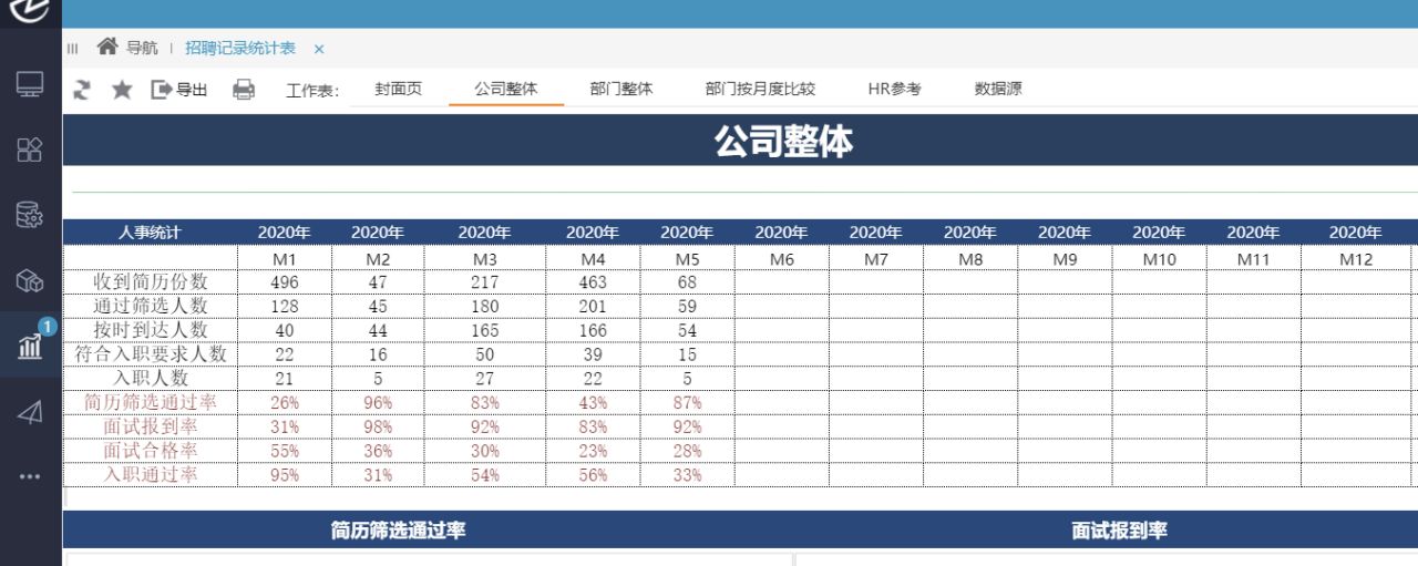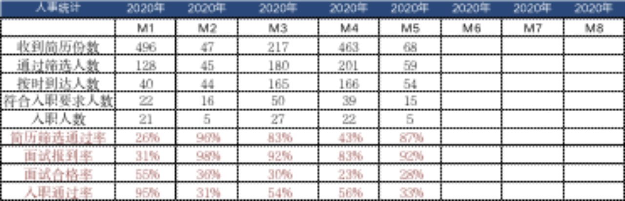 解决了数据库的问题,我们继续来做下面的工作。通过电子表格软件,我们可以很轻松的完成数据分析并呈现出来,给到领导汇报实际情况争取资源等等。例如我们可以设置招聘指标,从收到简历份数这个字段里,通过筛选的简历份数与未通过筛选的简历份数,用通过筛选的简历份数除以收到的简历份数,就可以得出简历筛选通过率这个指标;我们再看是否按时到达这个字段里,可以区分出是与否,用按时到达人数除以通过筛选人数可以得出面试报到率这个指标;是否符合入职要求这个字段可以区分出有多少人是通过面试的,用符合入职要求的人数除以按时到达的人数,可以得出面试合格率的数据;最后一个是用最终入职人数除以符合入职要求的的人数,得出入职通过率的数据,如图例所示: