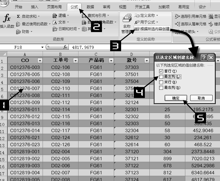 在【公式】选项卡中单击【根据所选内容创建】按钮,在弹出的【以选定区域创建名称】对话框中取消勾选【最左列】复选框,最后单击【确定】按钮完成设置,如图所示。