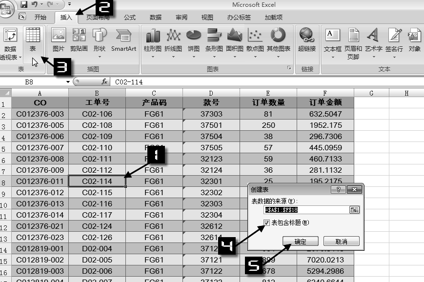 选中数据区域中的任意一个单元格(如B8),在【插入】选项卡中单击【表】按钮,弹出【创建表】对话框。