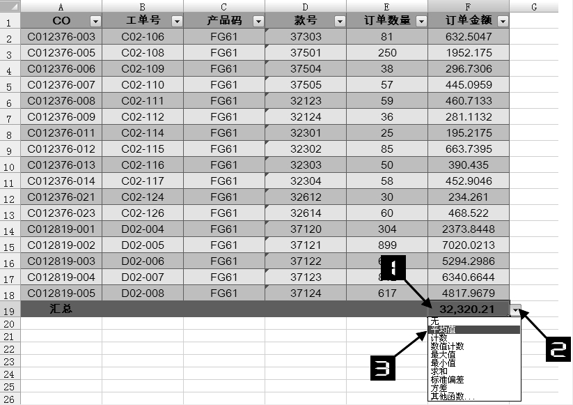 选定汇总方式后,Excel会在汇总行中自动创建相应的统计公式进行汇总计算
