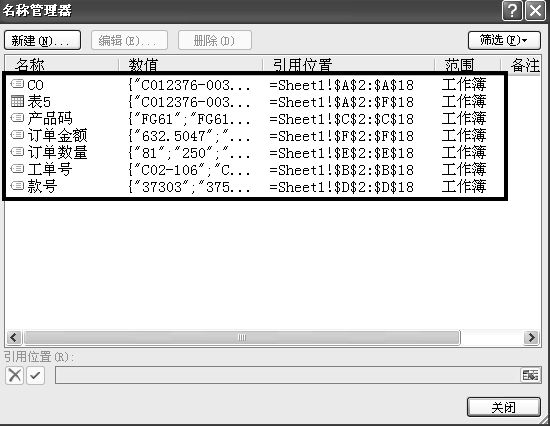 按<Ctrl+F3>组合键可以打开【名称管理器】对话框查看已经定义的名称,如图所示。