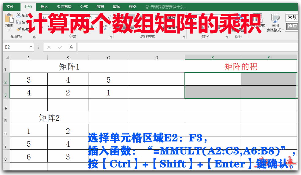 选择单元格区域E2:F3,插入函数:“=MMULT(A2:C3,A6:B8)”,按【Ctrl】+【Shift】+【Enter】键确认。