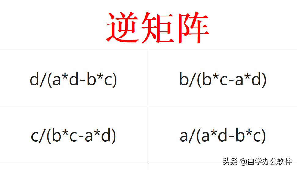 假设数组 A2:B3中包含以 a、b、c 、d 四个任意的数,则 A2:B3的逆矩阵表示如下: